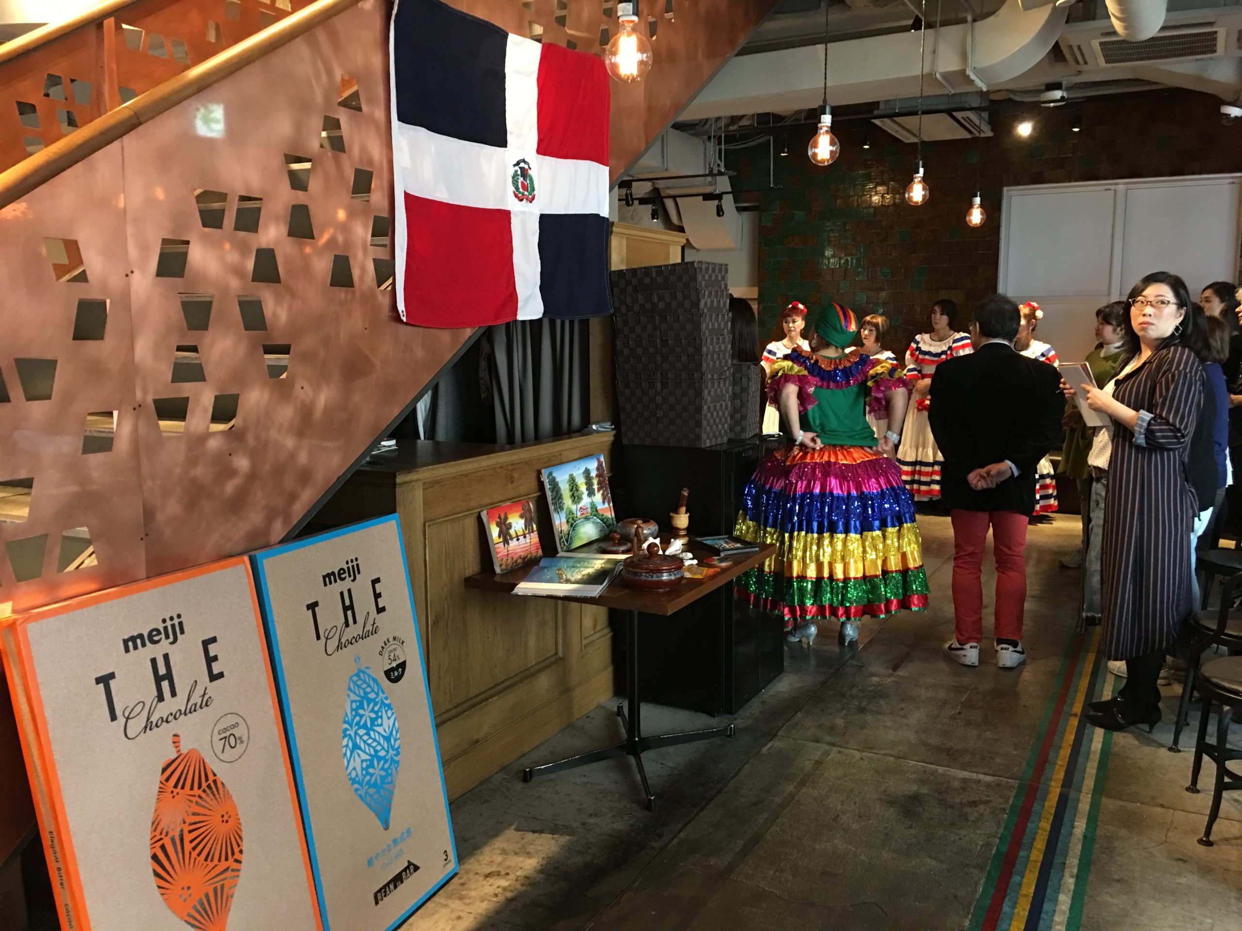 En pasado 26 de Noviembre, participamos al taller de chocolate “Hello Chocolate LESSON”, organizado por Meiji colaborando con el restaurante latino, TORO TOKYO.  Además de aprender los básicos de como los chocolates son producido desde cacaos, los participantes se pueden disfrutar los encantos de chocolates desde los puntos de “cinco sentidos.”  Como República Dominican es enfocado principal de este taller, la Asociación le ayuda Meiji con ofertas de los pequeños bienes dominicanos y decoración para establecer ambientes dominicanos en el taller.  Después de la lección desde Meiji, el Sr. Luis Sasaki y su grupo de bailadoras presentaron su actuación de danza a los participantes y también les dio una pequeña lección de merengue.  También nos disfrutamos las comidas dominicanas preparado por TORO TOKYO.  El taller nos ha dado oportunidades para intercambiar con la gente que no la Asociación comunica en general y aprendemos mucho desde los participantes acerca de su nivel del conocimiento sobre la república.  ¡Muchas gracias por sus colaboración y atención, Meiji, el Sr. Luis Sasaki (y su grupo de bailadoras) y el restaurante TORO TOKYO!