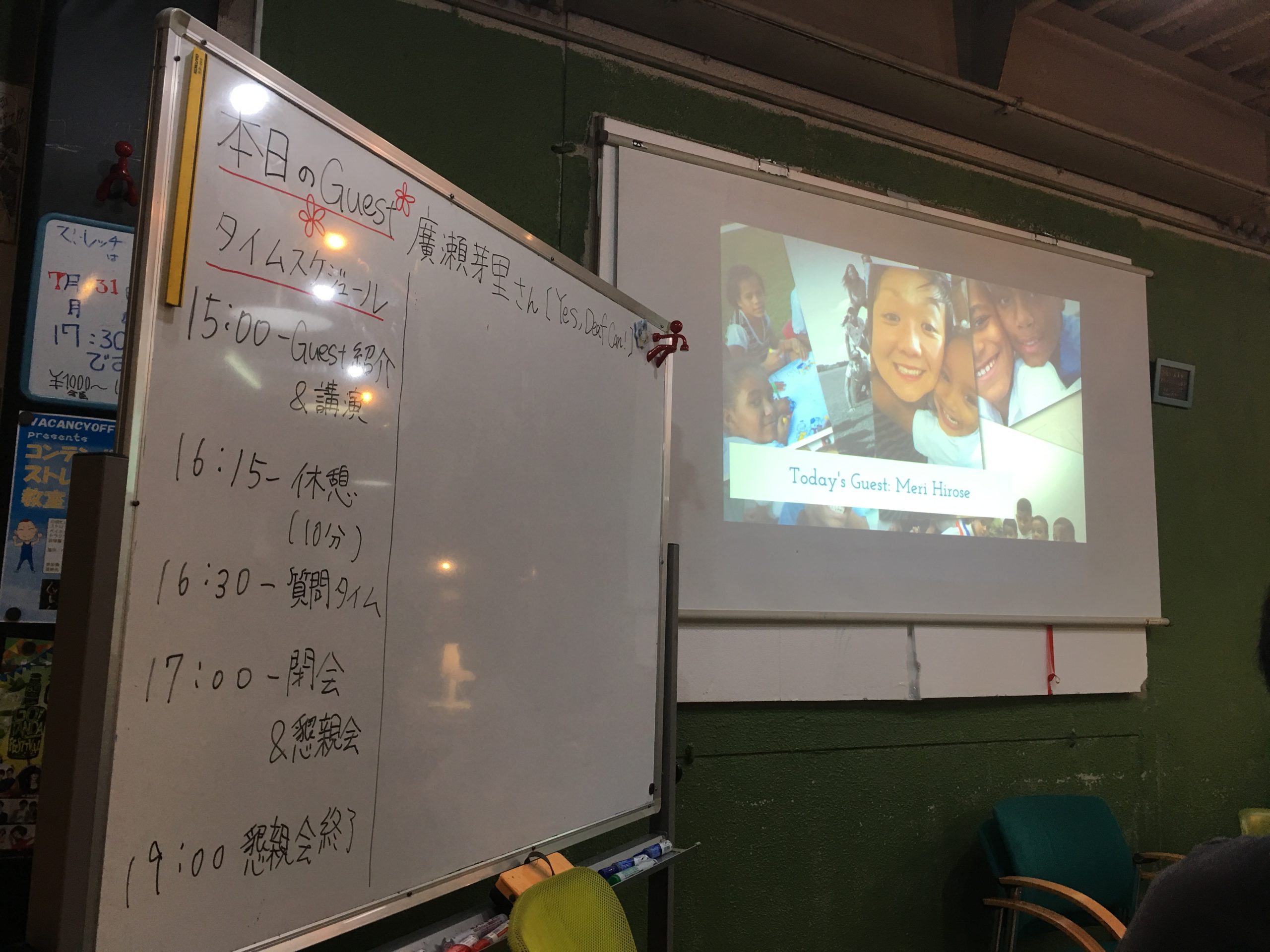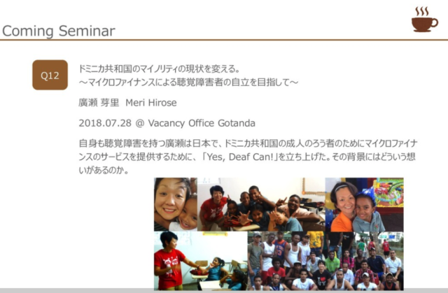 去る7月28日(土)、当協会会員で「Yes, Deaf Can!」の代表を務める廣瀬芽里さんがQ’s Cafeにご登壇されましたので、お話を伺いに行ってまいりました。Q’s Cafeとは海外途上国の現場で、誰にも知られていないユニーク且つベンチャーマインドを持った活動をしている方々を招き、ご自身の活動について語って頂くセッションです(小職の友人である柗上純一郎さんが主宰しています)。廣瀬さんからは、ろう者の全障害者における割合や、国連障害者権利条約、ドミニカ共和国におけるJICAボランティア、ろう学校での活動、職業訓練プログラムの設立などについてお話がありました。その中でも、社会進出が許されず、自信が持てなかったドミニカ共和国のろう者の子どもたちが、自らも“出来る”というマインドを持ち、前に進んて行く姿が一番印象に残りました。プレゼン内には、ドミニカ共和国に関するクイズもあり、参加者の皆さんにとって少しでもドミニカ共和国についてお知り頂く機会にもなったかと思います!