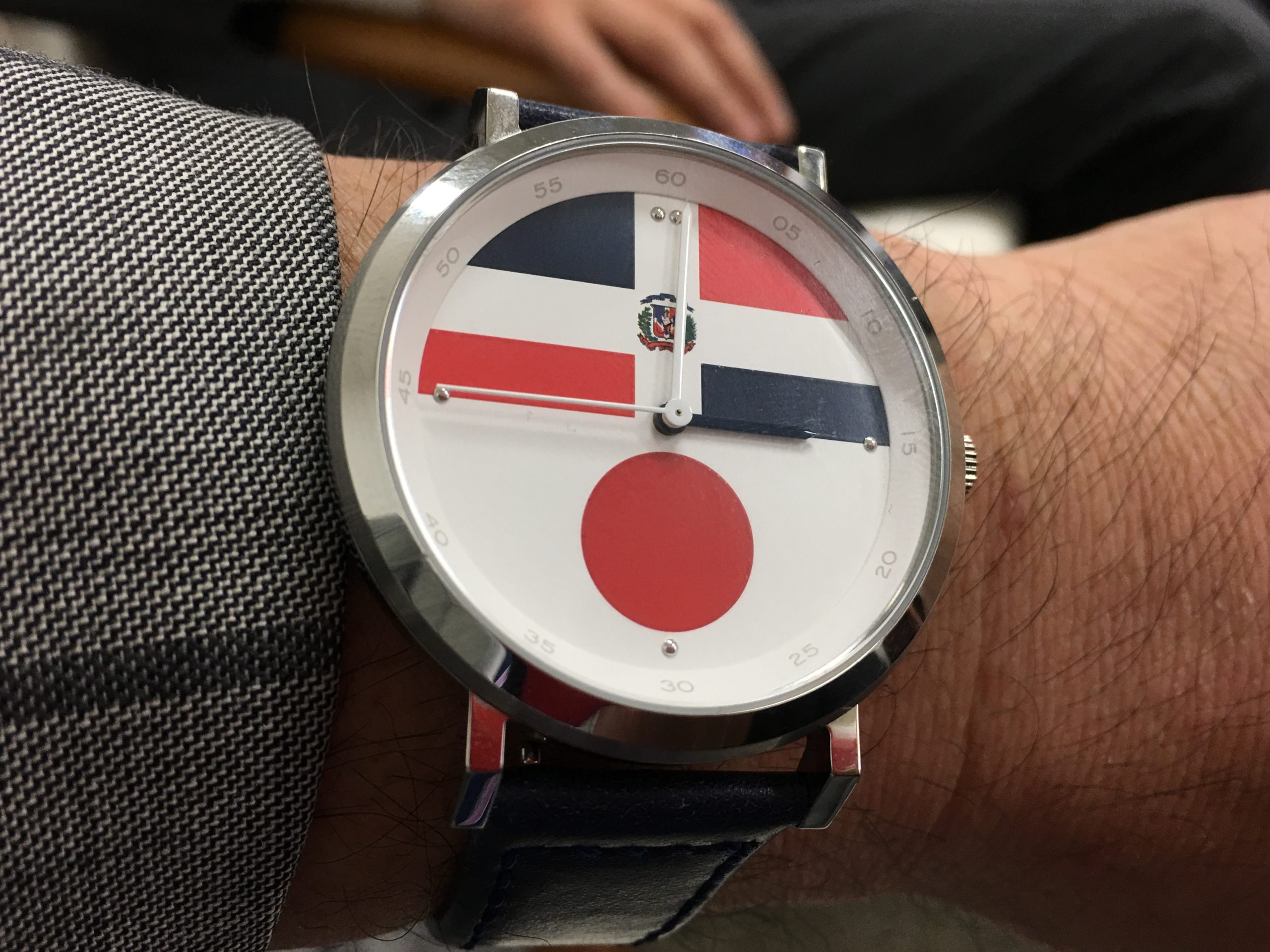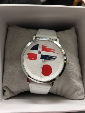 去る5月8日、駐日ドミニカ共和国大使館に於いて、ドミンゲス駐日大使とJapan Export Import社の川代社長(日系ドミニカ人)と共に、AccessBioの折原さま、松戸市観光協会の須田さまがお持ちになられた「ドミニカンスタイル腕時計」を拝見する機会に恵まれました。折原さまがデザインされた時計を東京オリンピックにて、ドミニカ共和国ソフトボールチームのホストタウンとなる松戸市が採用し、関係する方々に配布されているとのことです。今後オリンピックを控え、日本とドミニカ共和国をつなぐための様々なグッズやアイテムが各ホストタウンから出てくると思います。当協会も全面的に広報の面から支援させて頂きたく存じます!
