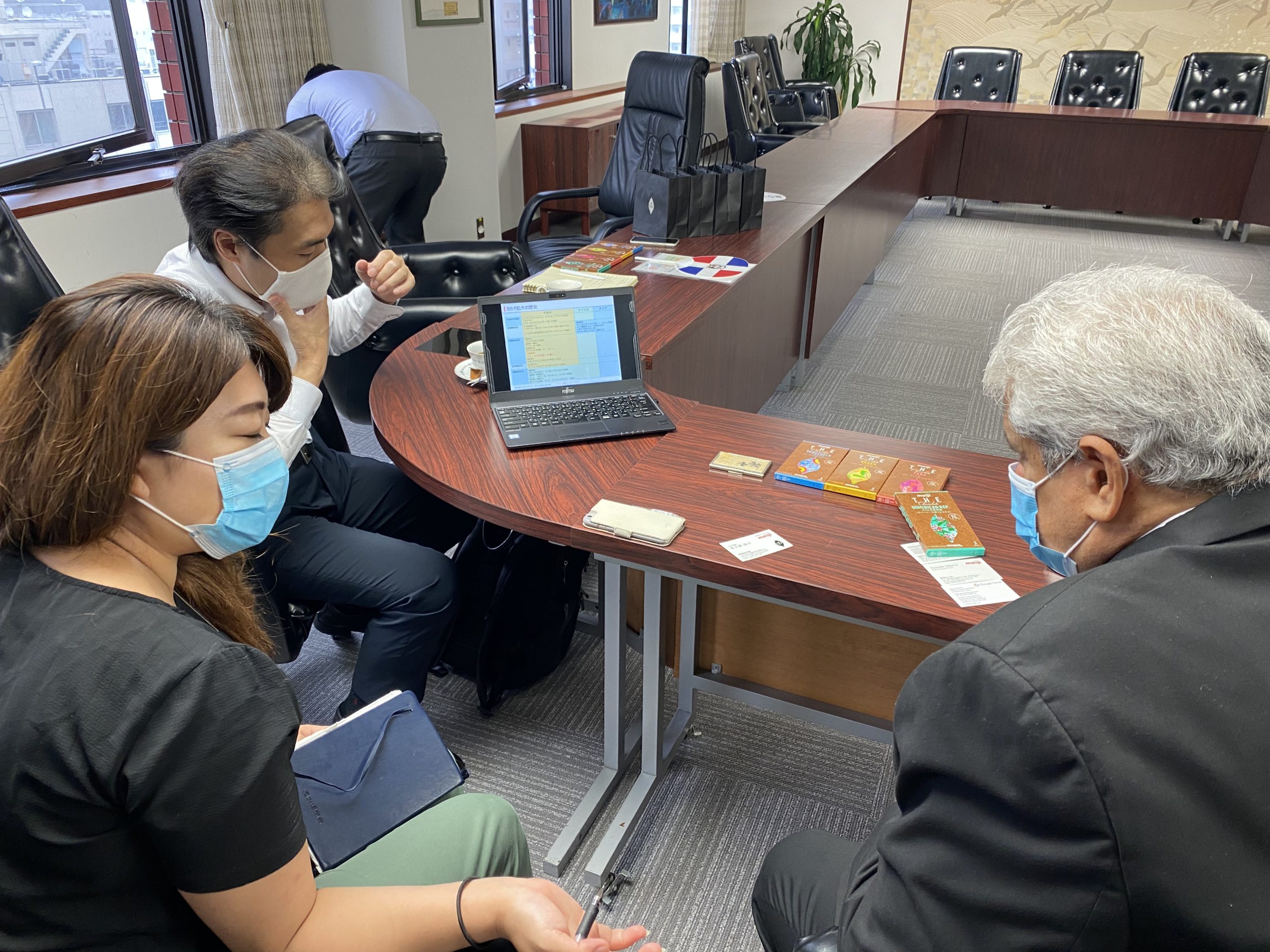 こちら記載が大変遅くなってしまいましたが、昨年9月某日に株式会社明治イノベーションセンター菓子開発研究部長の宇都宮洋之さま、同カカオ開発部の佐久間悠介さまと共に、在日ドミニカ共和国大使館に、エクトール・ドミンゲス大使(当時)を訪問させて頂きました。明治さまより、9月29日にブランド・リニューアル予定(当時)の”THE Chocolate”について様々な説明がありました。今回はカカオの「生産国名」を全面に出し(ブラジル、ベネズエラ、ペルー、ドミニカ共和国)、カカオ成分が高い(70%)のチョコレートを作ることで、皆様に各国のカカオの違い(特に香り)を楽しんで頂きたいとのことでした(ドミニカ共和国のカカオに関する解説はこちら)。その後行われたドミンゲス大使のお別れ会にも、明治さまよりTHE Chocolateを来訪された方々にお出し頂くなど、当協会の活動にご協力頂いており、心より御礼申し上げます。2021年も引き続き、ドミニカ共和国のガストロノミーを皆様に紹介させて頂く所存です!
