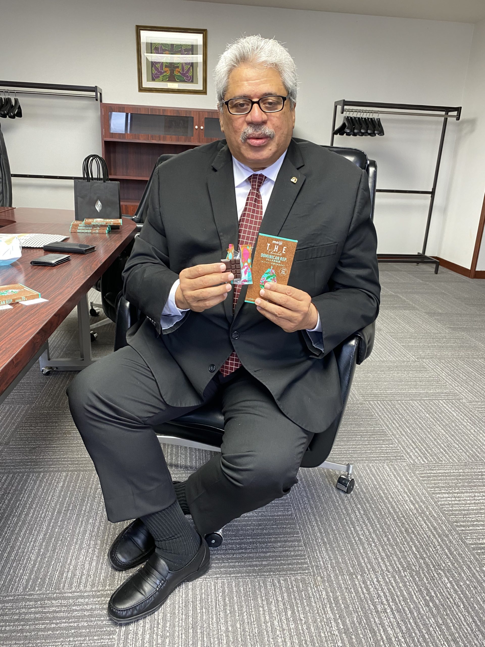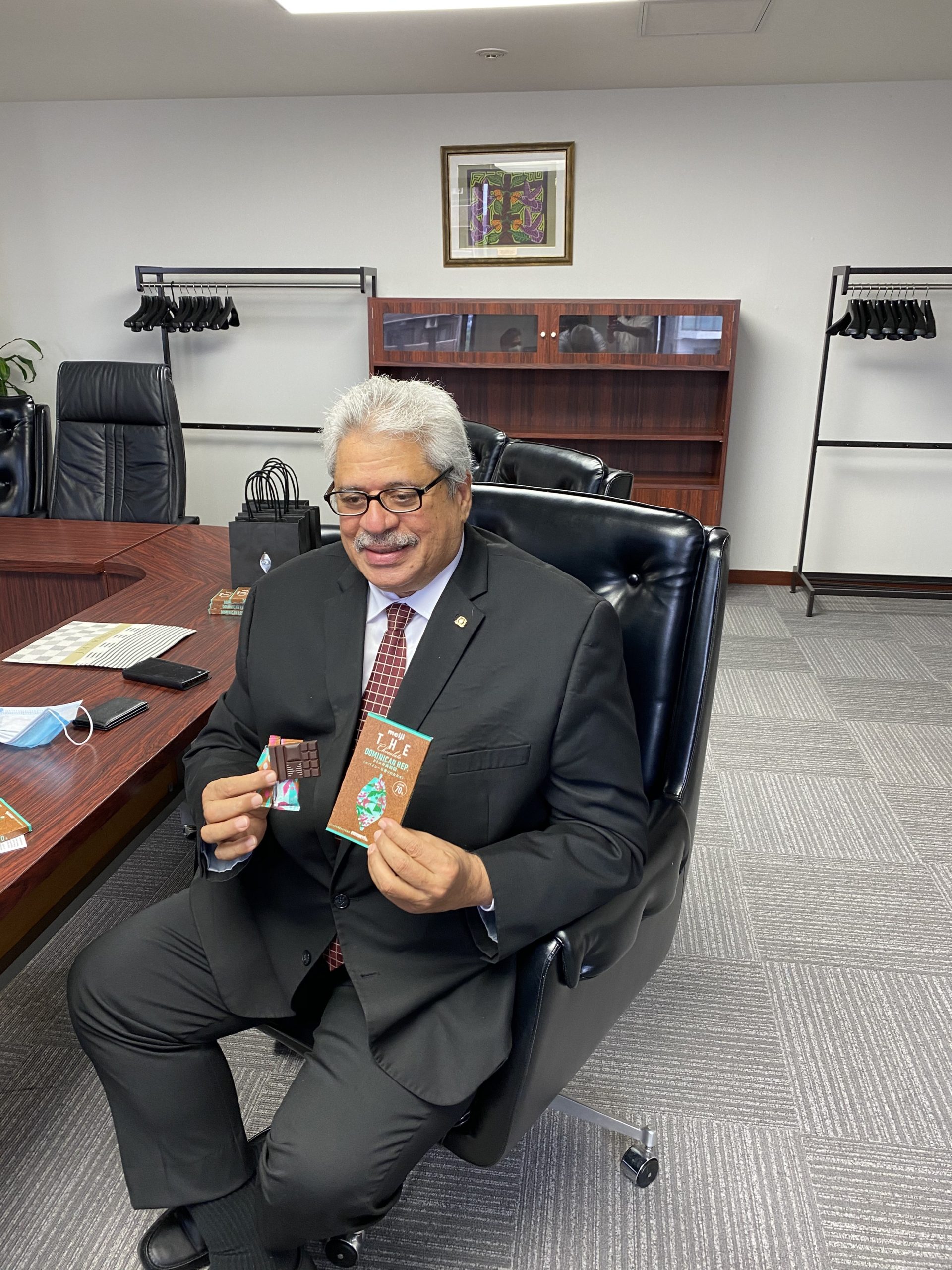 Permítanme disculparme por la publicación tardía. En septiembre pasado, visitamos al Embajador Domínguez con el Sr. Hiroyuki Utsunomiya, Director del Departamento de Investigación, Centro de Innovación Meiji, y el Sr. Yusuke Sakuma, Departamento de Desarrollo de Cacao, Meiji Co., Ltd en la Embajada Dominicana en Tokio. Los dos representantes de Meiji explicaron al Embajador sobre la última actualización de la marca “THE Chocolate“, que estaba programada para el 29 de septiembre. Según ellos, en la última actualización, la empresa chocolatera indicó claramente “países de origen” del cacao (Brasil, Venezuela, Perú, República Dominicana) y también creó chocolates con alto contenido de cacao (70%) para que los consumidores puedan disfrutar la fragancia más (haga clic aquí para más detalles). De hecho, nos gustaría expresar nuestro más sincero agradecimiento a Meiji Co., Ltd por su colaboración con nuestras actividades, incluida la fiesta de despedida del Embajador Domínguez (ofreciendo chocolates a los participantes). ¡Continuaremos presentando la gastronomía de República Dominicana a todos en 2021!